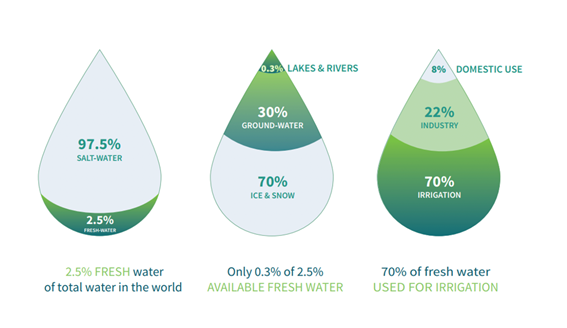 El agua es un bien económico, es decir, escaso. En el planeta Tierra, el agua es muy abundante, pero la mayoría es agua salada, que no podemos usar ni para el consumo humano ni para la agricultura. Sólo un 2.5 % del agua que hay en el planeta es agua dulce, de este porcentaje, tan sólo menos del 1 % es el que podemos usar. Alrededor del 70 % del agua que usa el hombre lo hace en la agricultura. Este porcentaje varía según los países. De ahí que ahorrar agua en la agricultura es fundamental.
